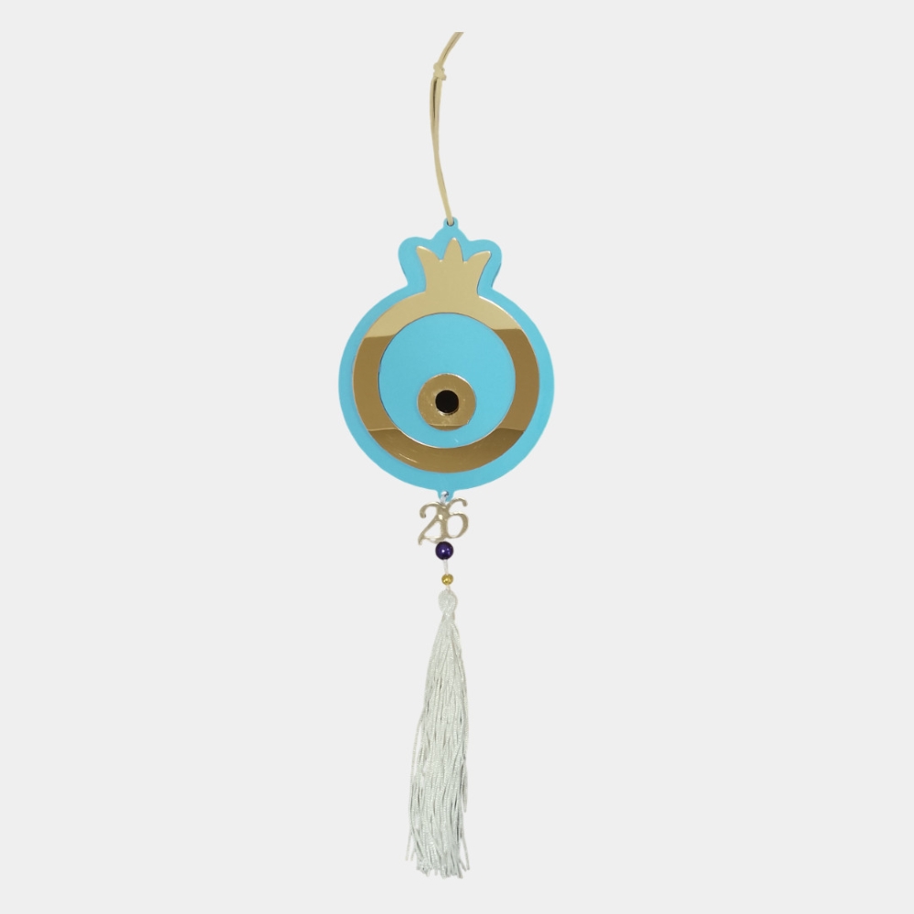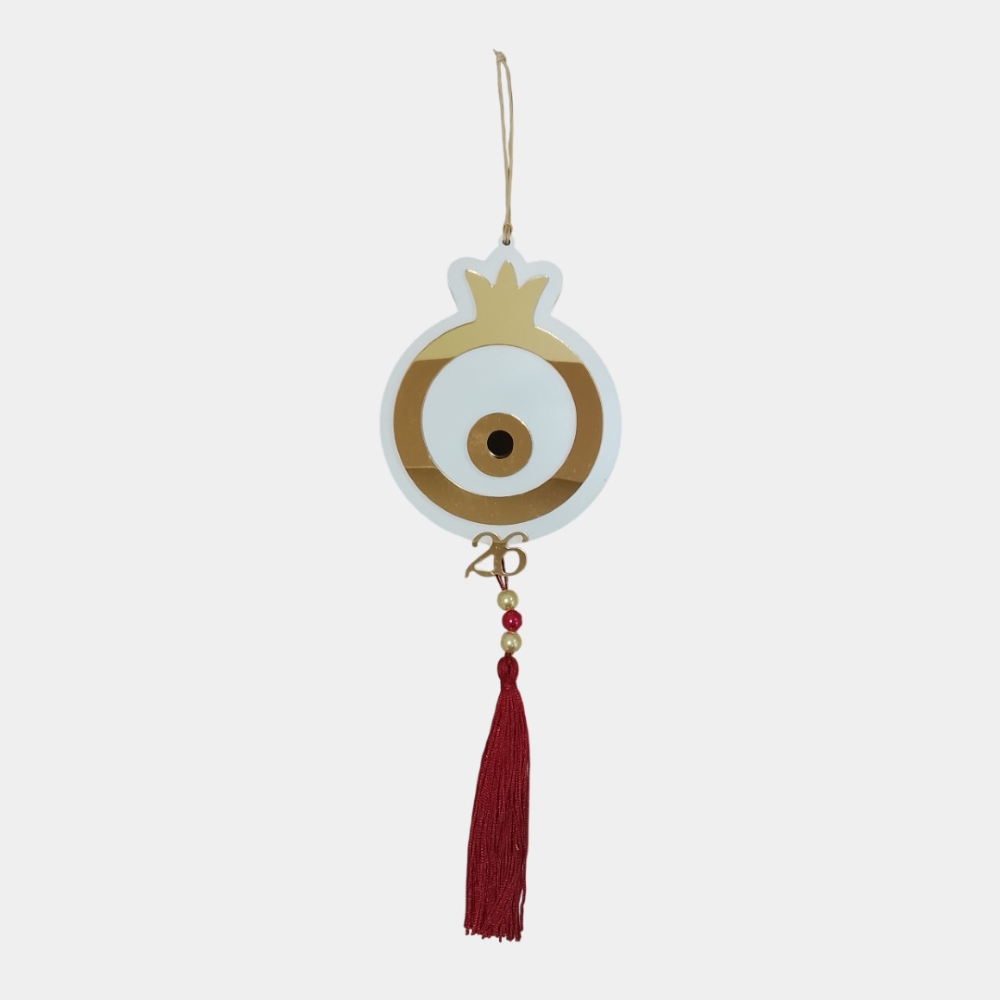 Ξύλινο κρεμαστό γούρι σε σχήμα σπιτιού, με λεπτομέρειες από χρυσό καθρέφτη πλέξιγκλας και τον αριθμό 26 για τη νέα χρονιά. Διακοσμείται με πολύχρωμες χάντρες και χρυσή φούντα, και διατίθεται σε τέσσερα χρώματα: λευκό, κόκκινο, θαλασσί και μέντα. Ιδανικό για δώρο, είσοδο σπιτιού ή επαγγελματικού χώρου. Ένα γούρι που συμβολίζει ευημερία, τύχη και ανανέωση.