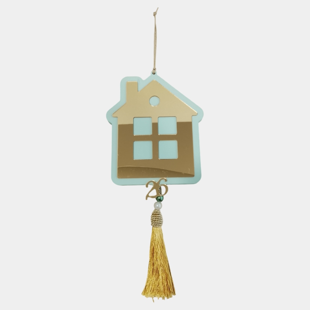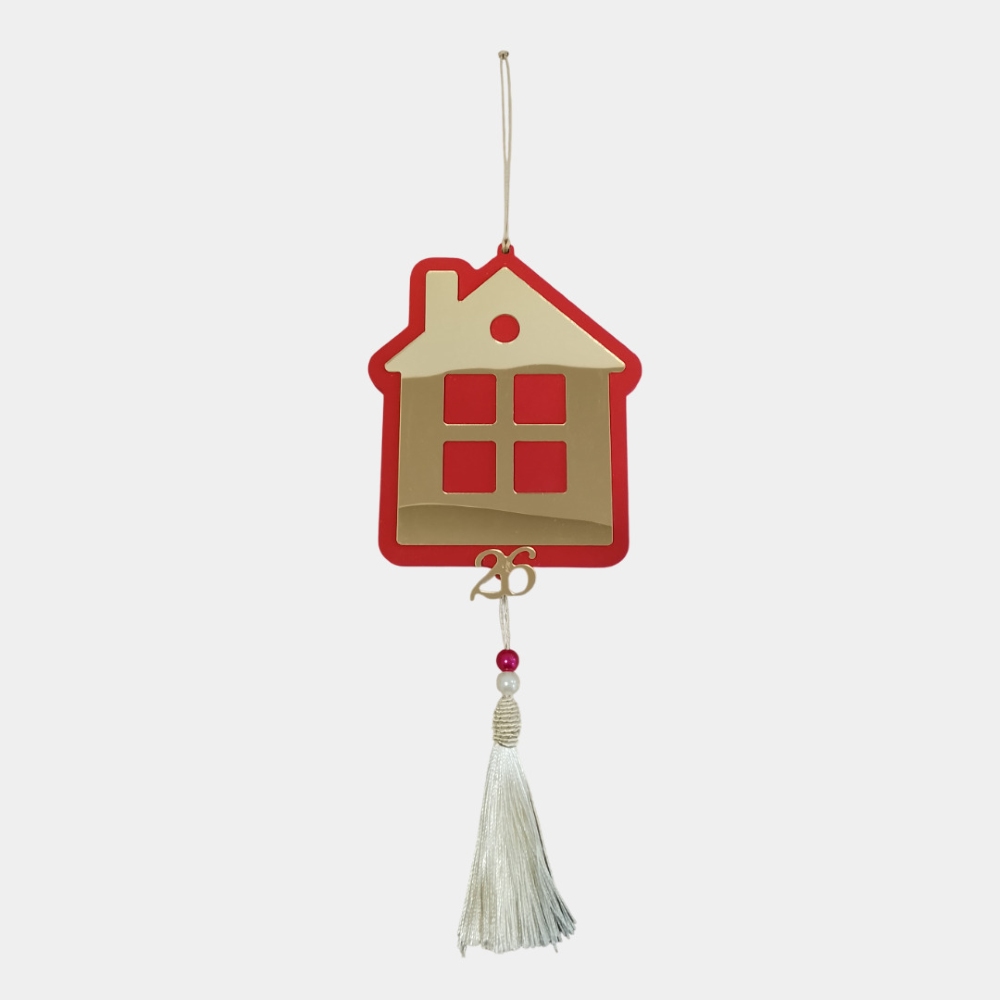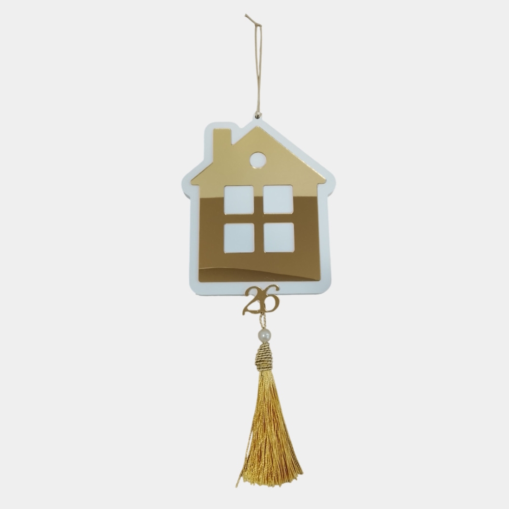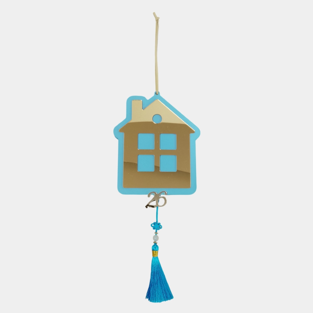 Ξύλινο κρεμαστό γούρι σε σχήμα σπιτιού, με λεπτομέρειες από χρυσό καθρέφτη πλέξιγκλας και τον αριθμό 26 για τη νέα χρονιά. Διακοσμείται με πολύχρωμες χάντρες και χρυσή φούντα, και διατίθεται σε τέσσερα χρώματα: λευκό, κόκκινο, θαλασσί και μέντα. Ιδανικό για δώρο, είσοδο σπιτιού ή επαγγελματικού χώρου. Ένα γούρι που συμβολίζει οικογενειακή θαλπωρή, τύχη και νέα ξεκινήματα.