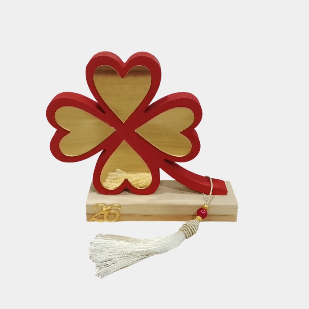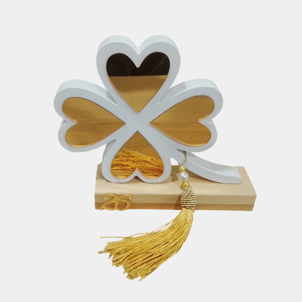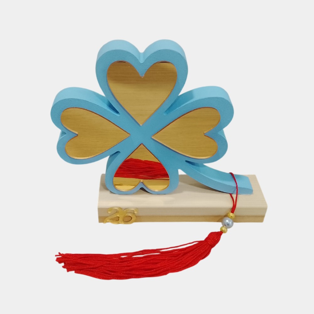 Ένα μοναδικό γούρι σε σχήμα τριφυλλιού, φτιαγμένο με προσοχή στη λεπτομέρεια και έμπνευση από την ελληνική παράδοση. Κατασκευασμένο από ξύλο πάχους 16 χιλιοστών, με στοιχεία από πλέξιγκλας χρυσού καθρέφτη και διακοσμητική φούντα. Βαμμένο με οικολογικά χρώματα κιμωλίας σε τέσσερις υπέροχες αποχρώσεις: κόκκινο, θαλασσί, μέντα και λευκό. Η βάση παραμένει στο φυσικό χρώμα του ξύλου, προσδίδοντας ζεστασιά και αυθεντικότητα. Ιδανικό για δώρο ή διακόσμηση, με διαστάσεις 16,5 × 15,5 × 4 εκ.