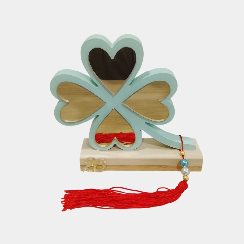 Χειροποίητο γούρι “Τριφύλλι” από ξύλο και πλέξιγκλας χρυσό καθρέφτη.